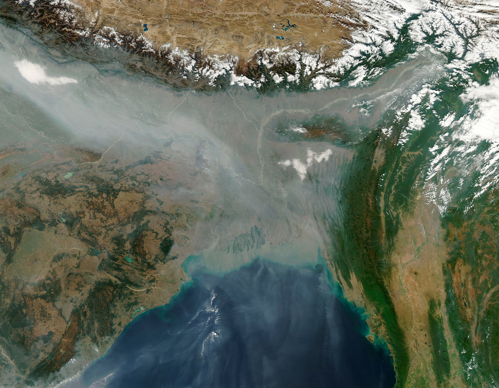 Jan. 10, 2013: In this photo from NASA’s Aqua satellite, haze below the Himalayas blankets Northern India and Bangladesh, likely the result of fires, urban and industrial pollution, and a meteorological phenomenon called temperature inversion.